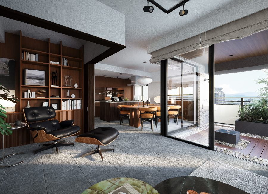 広いリビングルームとバルコニーは全面ガラスのコーナーサッシで、つながりと一体感が演出され、合わせて約30畳の優雅なリビング空間。