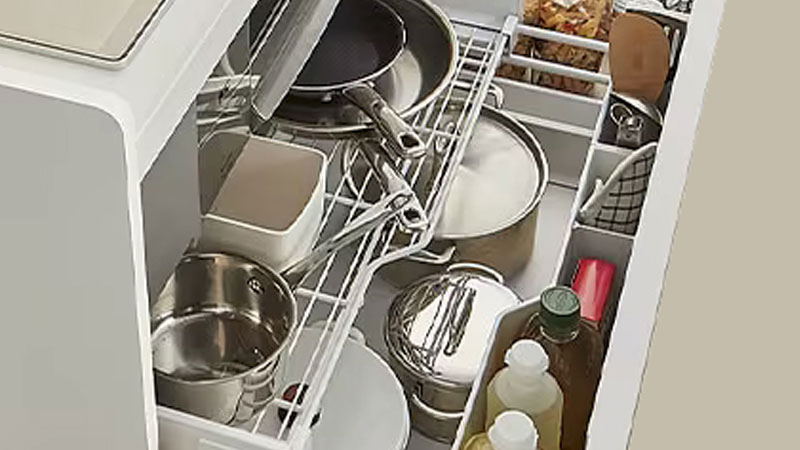 よく使うものがラクにパッと取り出せる。3つのポイントで料理をする時の労力や手間を減らし、調理作業をやさしくサポートする新感覚のフロア収納です。