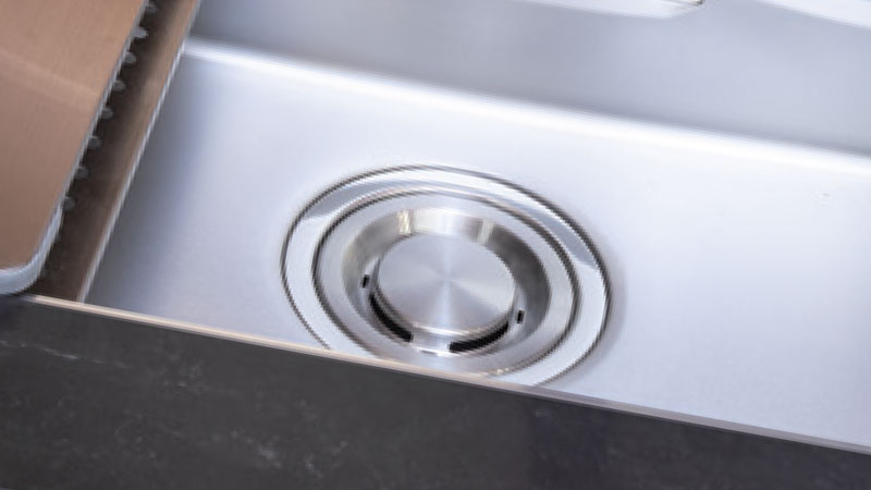 シンクの底に段差を付けているので、排水口の上に鍋を置いても水の流れを妨げません。