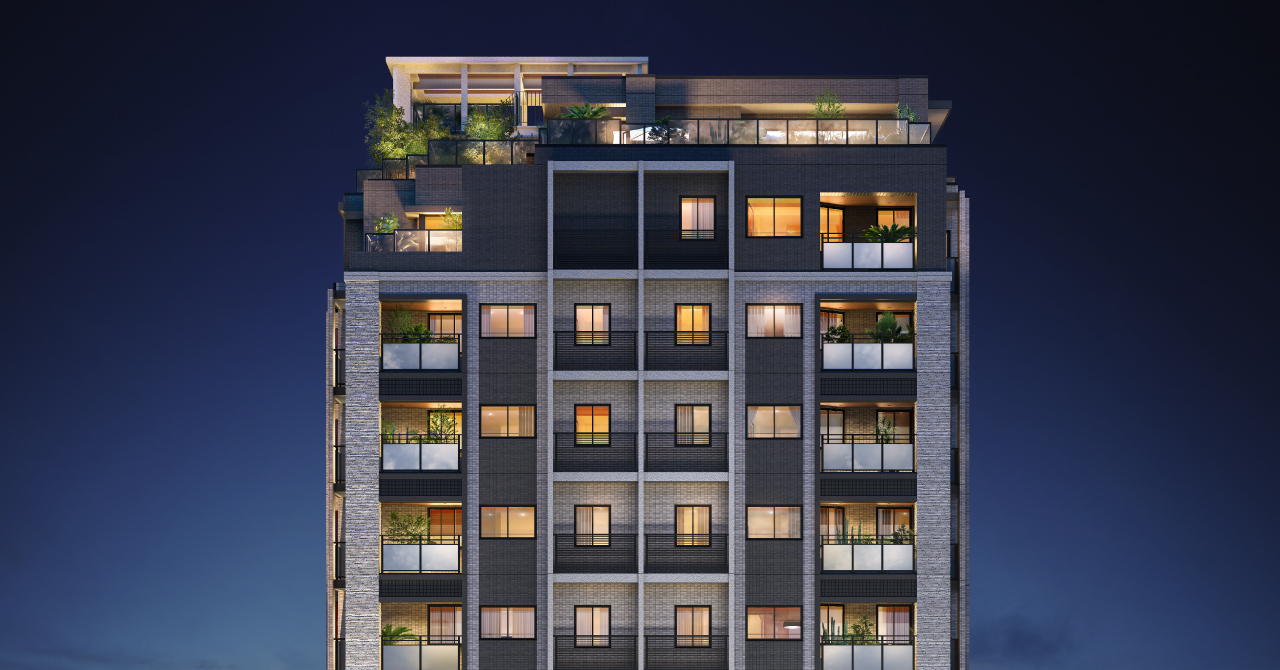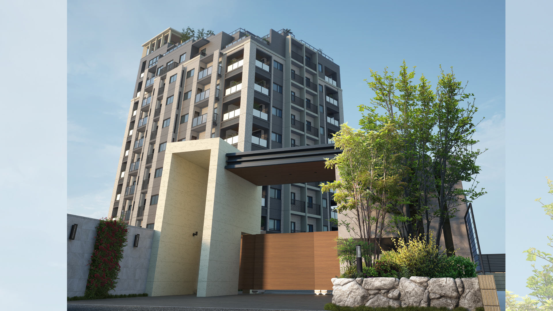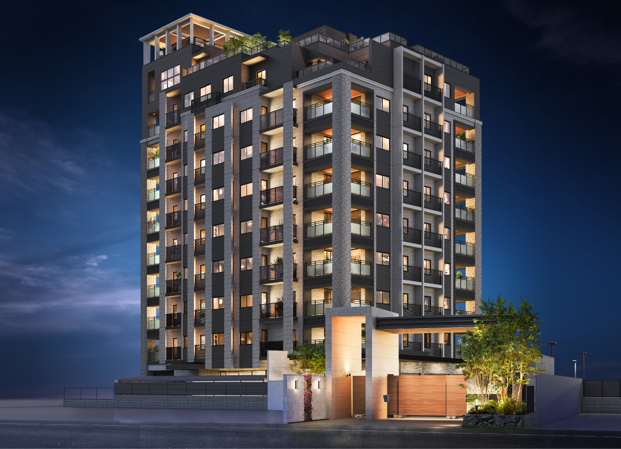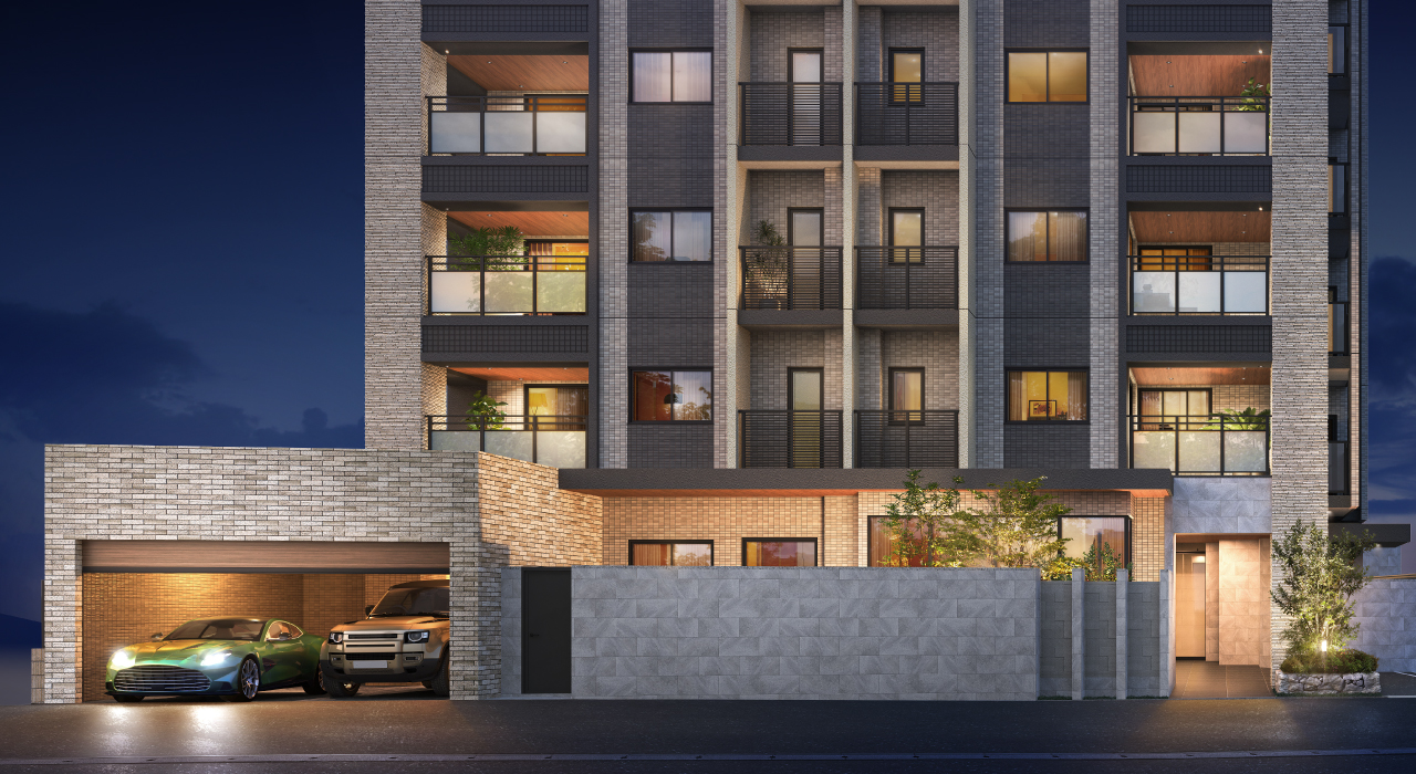 重厚感のある質感と水平・垂直の美しいラインが調和し、都市にありながらも静寂と落ち着きを感じさせる佇まい。夜には柔らかな光が窓辺からこぼれ、住まう人の豊かさを静かに物語ります。