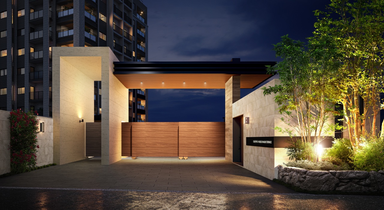 エクステリアでひときわ鮮やかに個性を主張するのは、エントランス上部を覆い、ガレージへと続く深いオーバーハング。快適性だけではなく優れたいデザイン性で「クラブ・ザ・ハウス」のブランドにふさわしい奥行を感じさせている。外壁は美しさと耐久性に優れた磁器質タイル張り。足元の御影石敷きフロアと相まってナチュラルテイストの高級感を醸し出す。周囲には、愛車を降りてそのままホールや自邸に向かえるビルトインガレージが並び、静かで美しい邸宅街の一面を思わせる雰囲気が漂う。