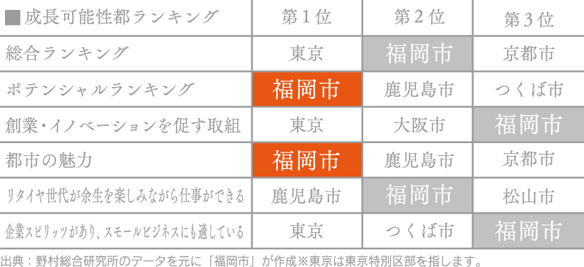 都市の産業創発力を「多様性を受け入れる風土」「創業・イノベーションを促す取り組み」「多様な産業が根付く基盤」「人材の充実・多様性」「都市の暮らしやすさ」「都市の魅力」という6つの視点から、131の指標を用いて総合的に分析。実績とポテンシャルの差で検出した「伸びしろ」度で福岡市は第1位となりました。つまり、福岡市は今後、日本の中で自立し、世界から外貨を獲得し、地域経済を辛引する「ローカルハブ」になる可能性を秘めた、最高ランクの「成長可能性都市」なのです。また、6つの視点に、人々が志向する多様なライフスタイルを加えた総合ランキングでも福岡市は東京特別区部に次いで2位にランクしています。