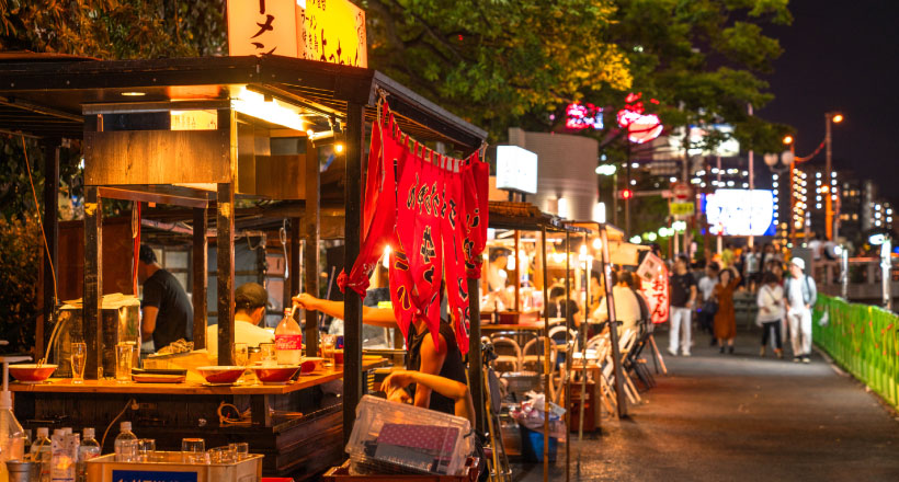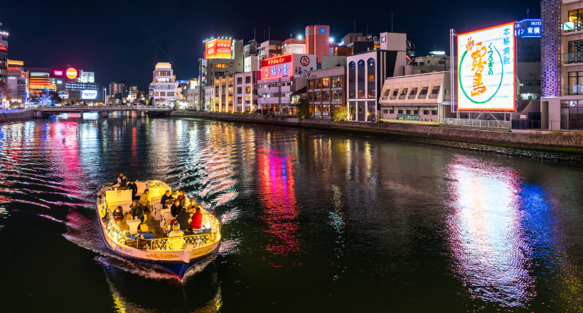 天神から徒歩10分。約2400の放食店が集まる中洲エリア。夜は那珂川沿いに約100件の屋台が出現する。独特の屋台文化に魅せられ、観光やビジネスで国内外から多くの人々が訪れる。