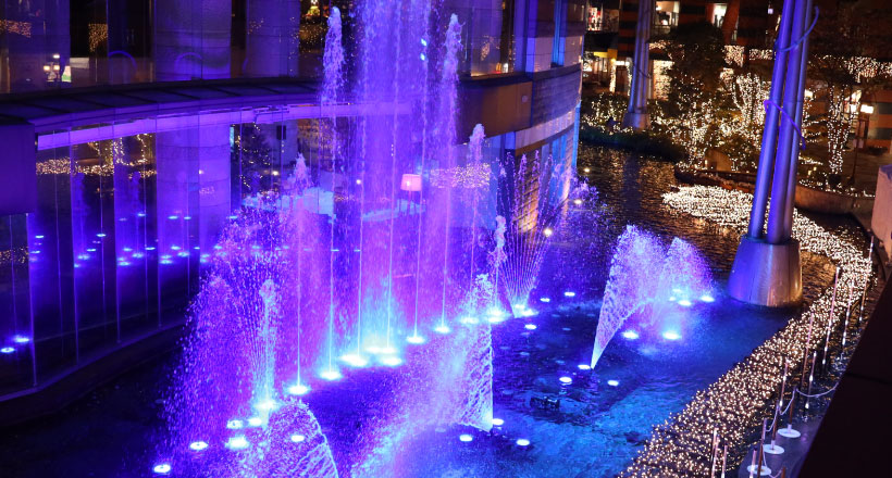 博多駅から徒歩10分。キャナルシティ博多は運河沿いに広がるドラマチック空間。ステージではイベントやライブ、音と光の噴水ショーが開催され、賑わいは夜も続く。