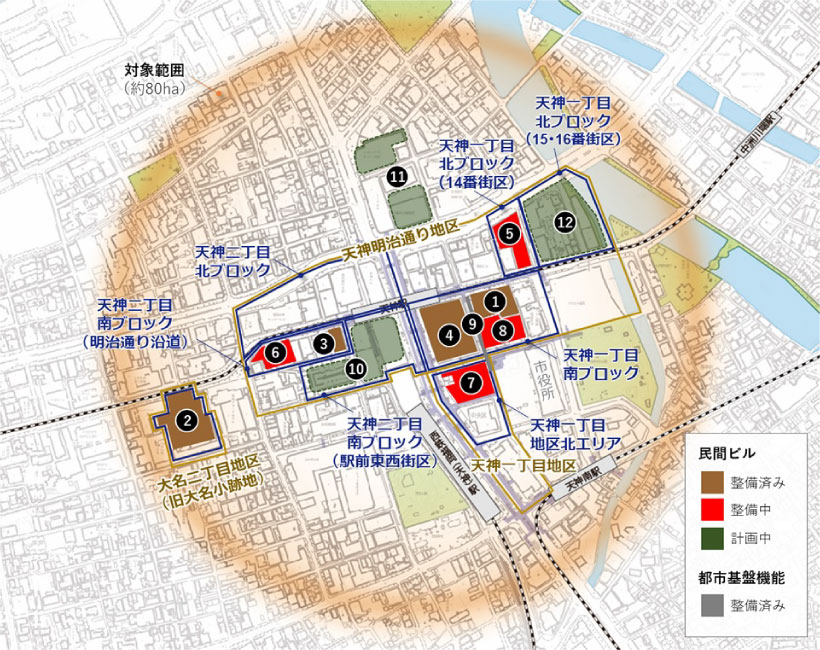 - ※10~12は、段階的および連鎖的な建替え計画として、天神ビッグバンボーナスの認定に向けて検討が進められているプロジェクトです。