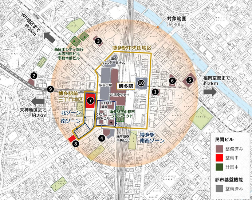 「博多コネクティッド」の開発工リアは博多駅から半径約500mの枠内。