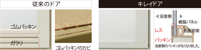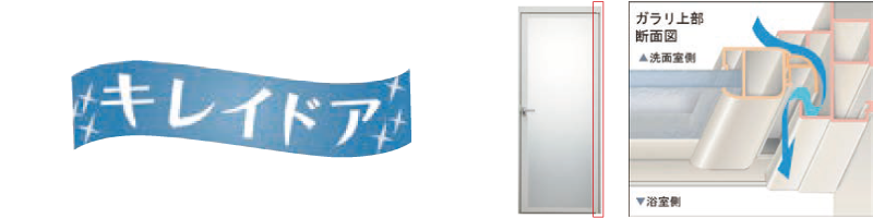 カビやすい浴室側のゴムパッキンをなくし、汚れがたまりやすいドア下部のガラリをタテ型に配置して、汚れにくいドアを実現。パッキンレスのフラット形状になり、お掃除の負担も大幅に軽減。