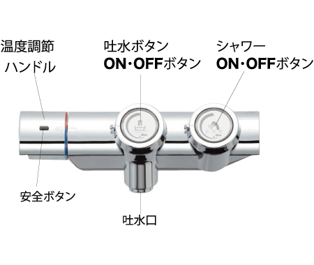 ON/OFFボタンを軽く押すだけで、シャワーと吐水を出したり、止めたりできます。シャワーと吐水のボタンを分けたので、間違えてシャワーがかかるような誤操作も防げます。プッシュ操作でカンタンに吐水・止水ができるため従来品に比べて50%の節水、省エネが可能です。