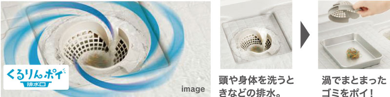 くるりんポイ排水口が進化!シャワーなどの排水時に渦を起こして、 髪の毛やゴミをへアキャッチャーの中央にパッとまとめます。