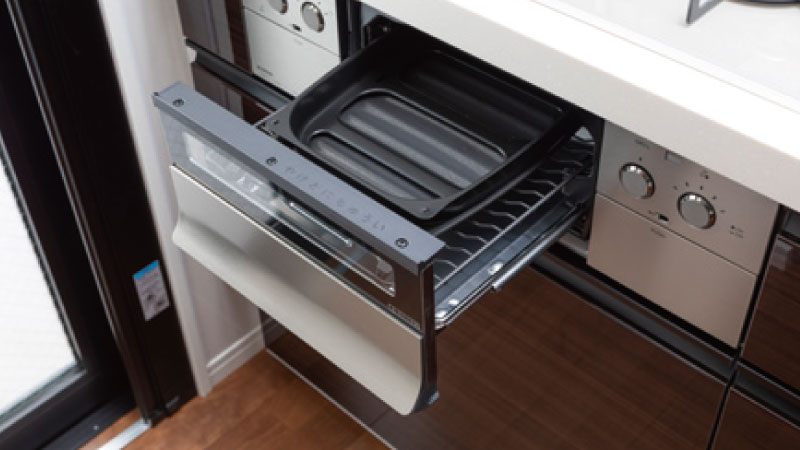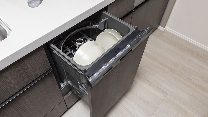 家族5人分の食器が一度に洗える省工ネ・低騒音の食器洗い乾燥機を採用。シンクそばに設置しているので、食器のセットもラクにでき、水ダレも防ぎます。