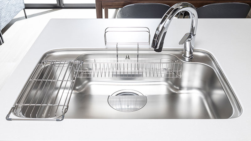 シンク裏面に振動を軽減する素材を貼り、水はね音をやさしくした静音仕様。独自の形状で調理スペースも広くとれるバランスのいいサイズです。