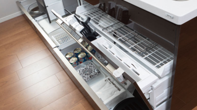 よく使うものがラクにパッと取り出せる。3つのポイントで料理をする時の労力や手間を減らし、調理作業をやさしくサポートする新感覚のフロア収納です。※1