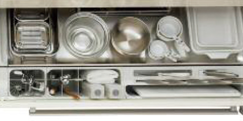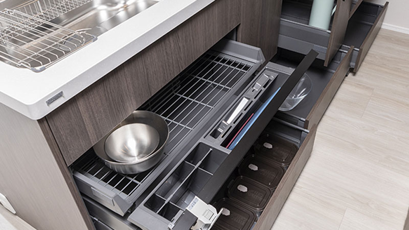 毎日の作業をもっとラクにしていただくために、引き出しを開ける力をぐんと軽くしました。調理道具をたっぷりしまった引き出しを開け閉めする時の労力を大幅に軽減できます。※1