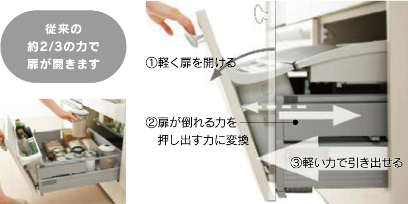テコの原理を応用した斜めに開く扉だから軽い力でラクに開けられます。