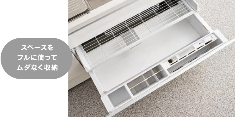 奥行きいっぱいまで引出せるので、簡単に出し入れでき、奥のスペースまで有効に使えます。