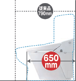 従来のタンク付きトイレよりも奥行寸法が140mm短いタンクレストイレ。動作空間が約35%(奥行1,200mm空間の場合)も広がって居心地よく過ごせます。