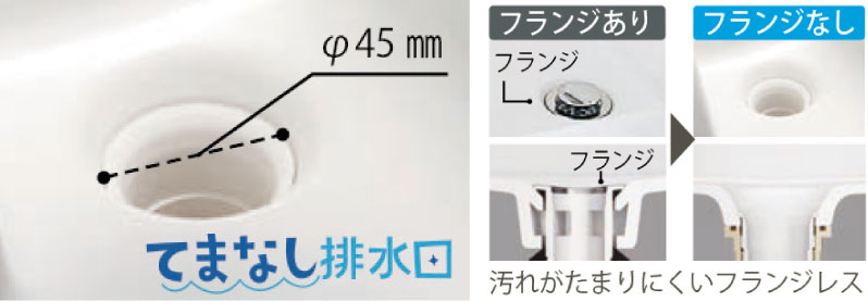 排水口はØ45mmの大口径なので、水はけが良く汚れが洗面器に残りにくくなります。