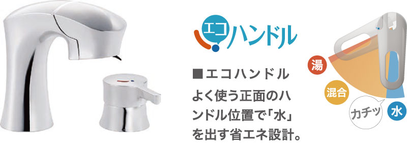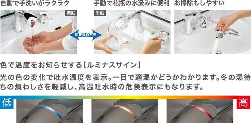自動吐水と手動吐水の切替操作が不要。手をふれずに差し出すだけでセンサーが感知し、自動で水を吐水します。花瓶の水汲みなどの連続吐水にはハンドル操作で手動吐水ができます。