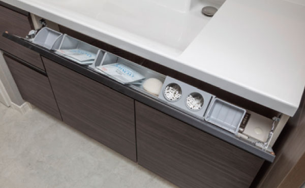 メイク道具などをラクな姿勢ですばやく取り出せるアイデア収納。散らかりがちなメイク道具をきれいに頓して収納できます。