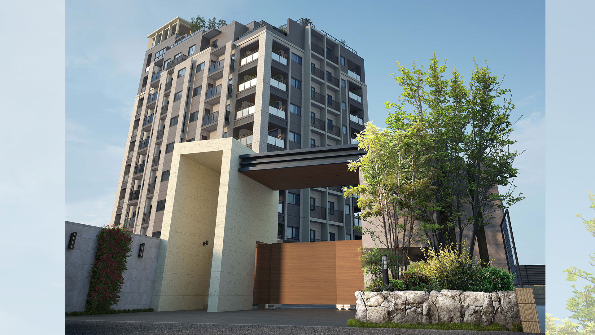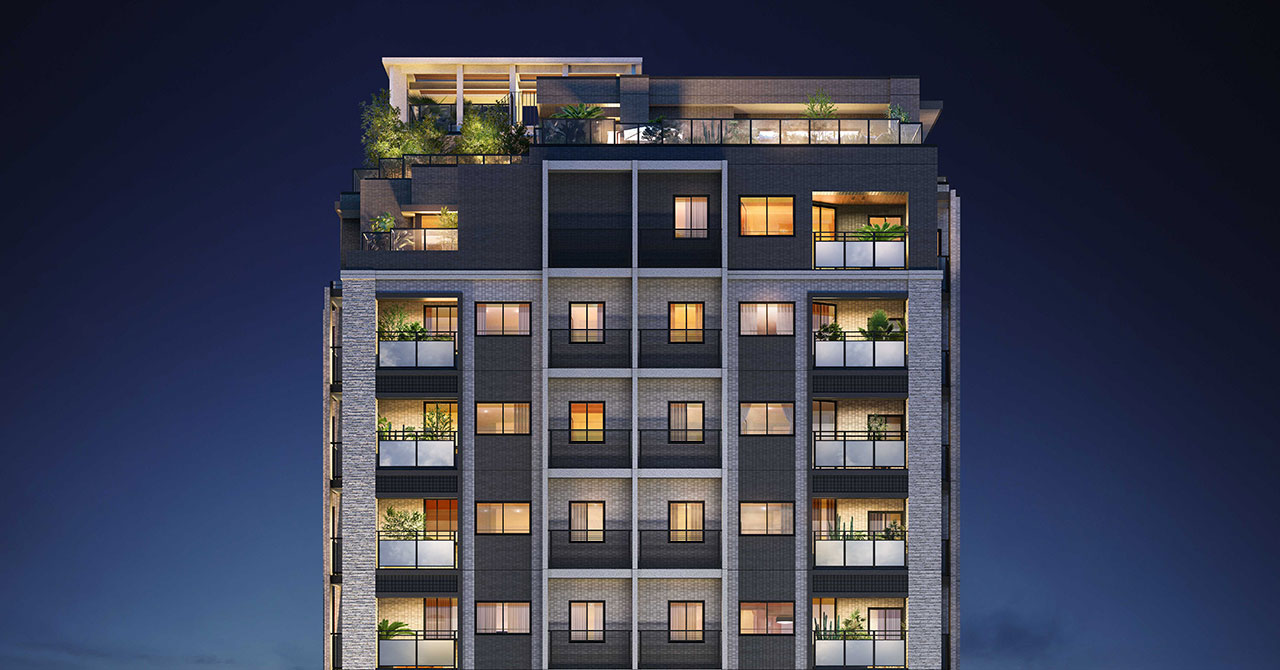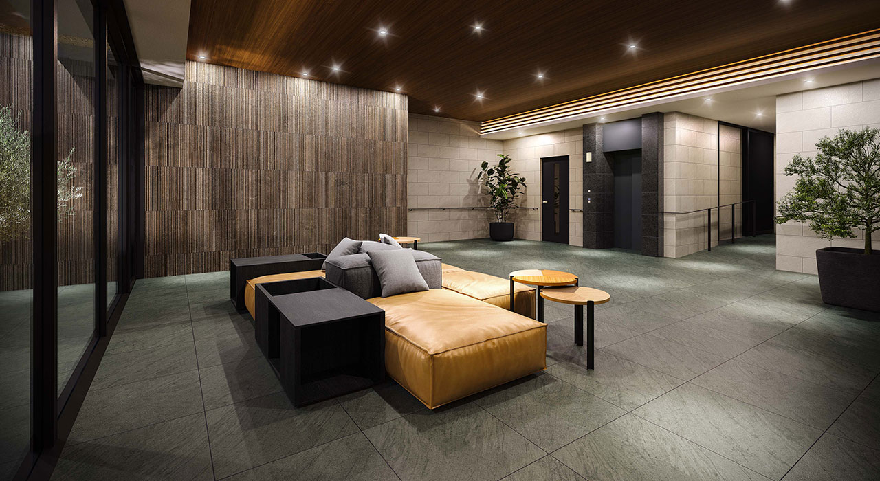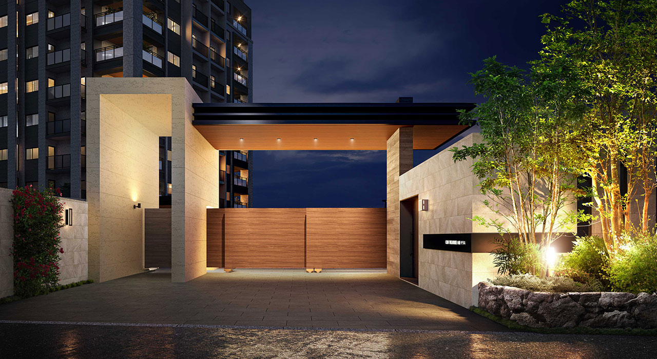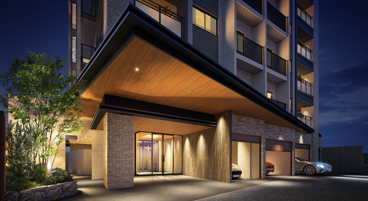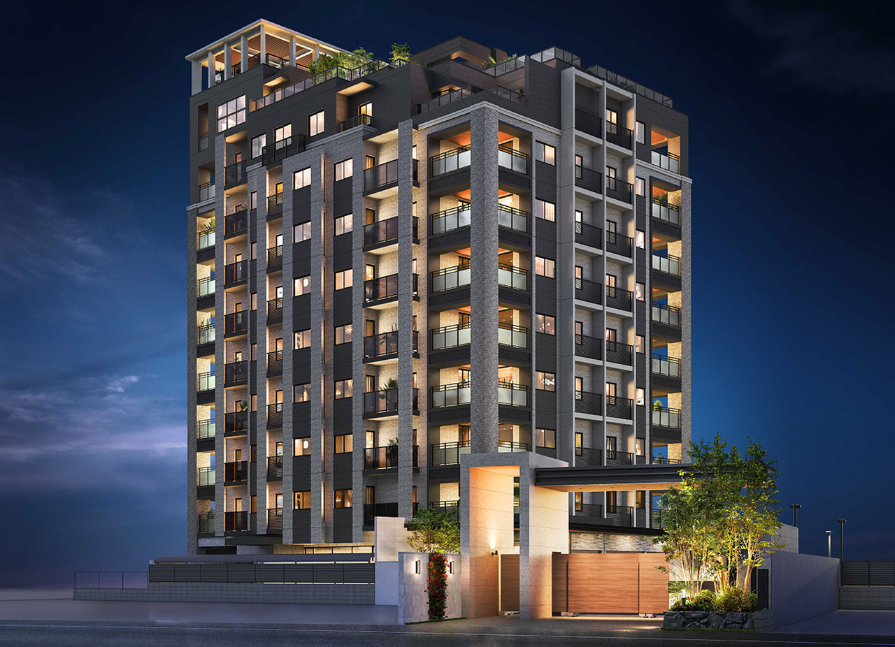 重厚感のある質感と水平・垂直の美しいラインが調和し、都市にありながらも静寂と落ち着きを感じさせる佇まい。夜には柔らかな光が窓辺からこぼれ、住まう人の豊かさを静かに物語ります。