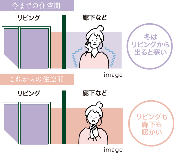 ZEH-M Orientedなら、リビングから廊下やトイレに行くときに寒さを感じたりすることが少なくなります。