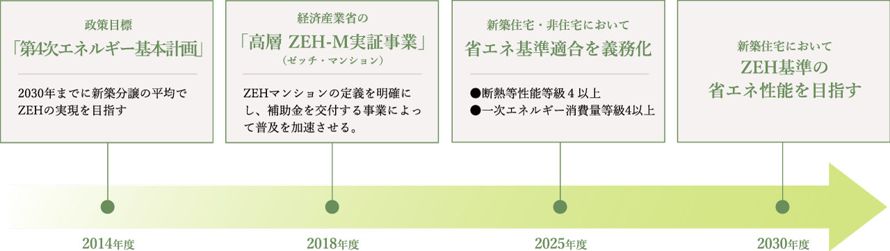 我が国ではエネルギー基本計画(令和3年10月)において、住宅については2030年までに省エネルギー基準を段階的に引上げ、温室効果ガス削減目標の実現を目指すとしています。当社はこれまでも、住宅事業において環境負荷の低減への取り組みを進めてまいりましたが、今後は経済産業省・環境省・国土交通省の住宅の省エネ・脱炭素化の方針に基づき、温室効果ガス削減に寄与する快適な住宅の創出をしてまいります。